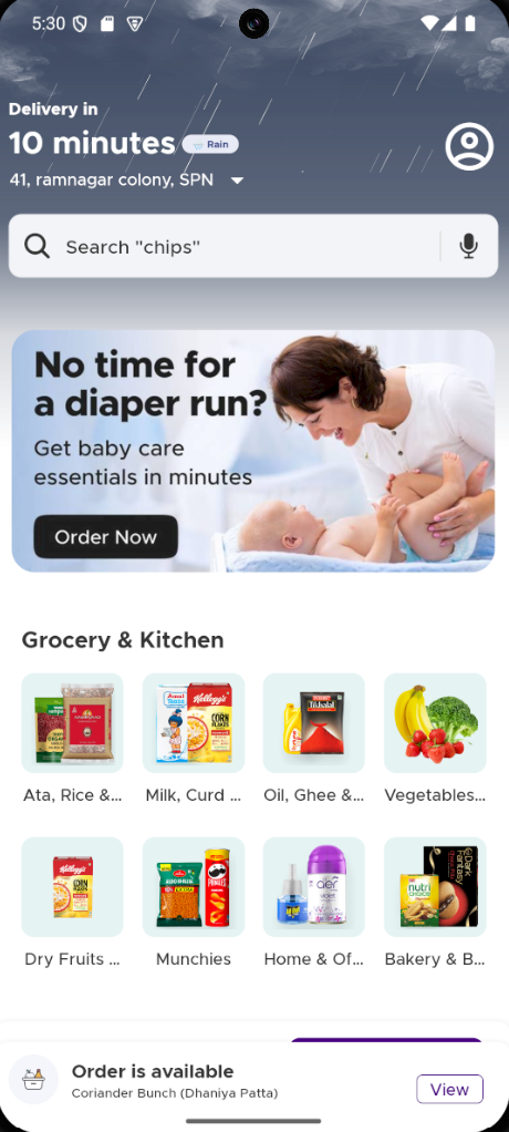 Groceries are typically delivered within 30–60 minutes, depending on your area and time of day.